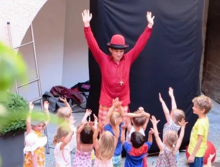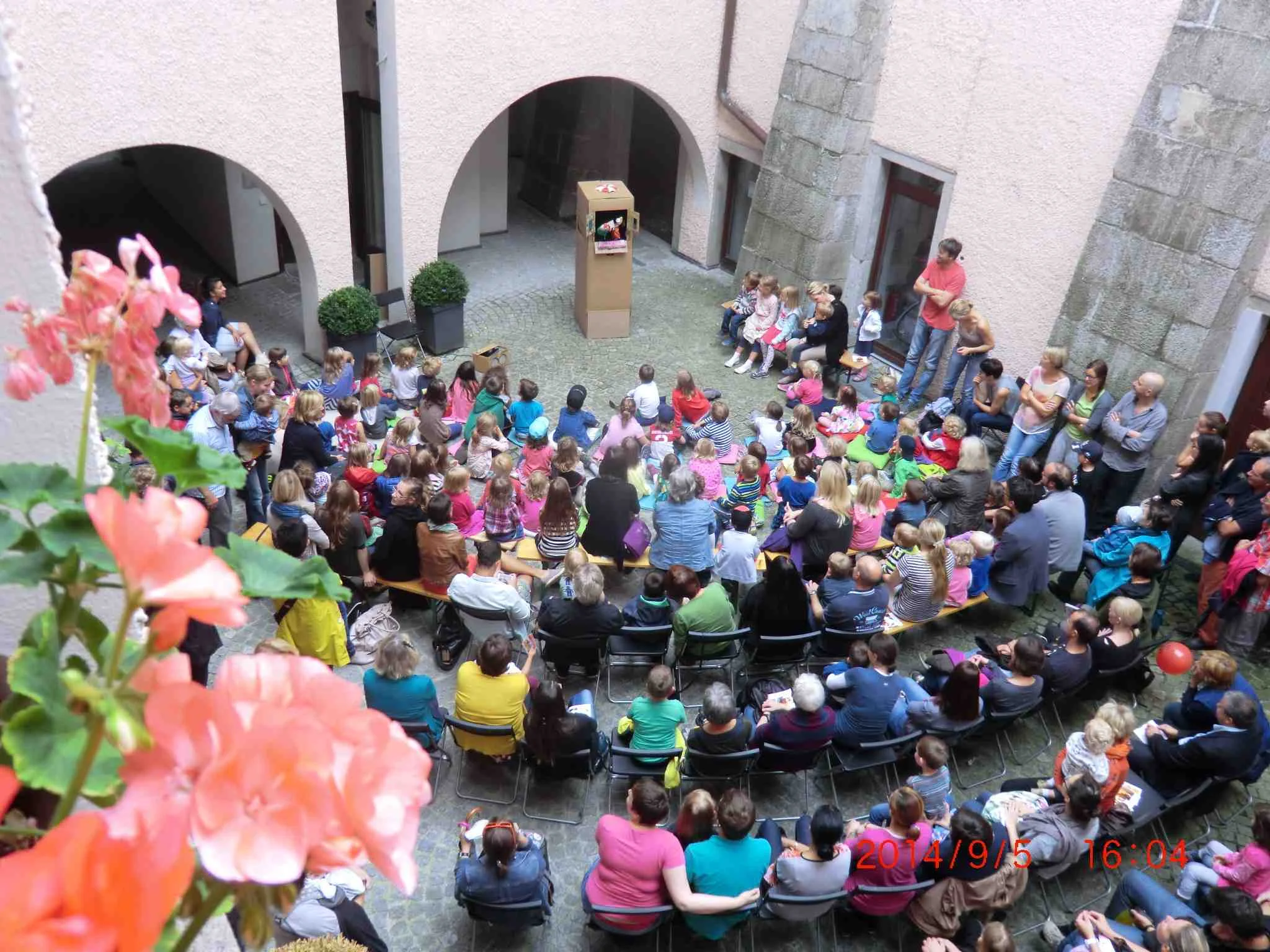 Meist sind es zwischen 60 und 80 Kinder, die hier mit ihren Eltern oder Großeltern Platz nehmen. Mal sind es weniger, manchmal bei Programmpunkten wie einem Mai Cocopelli-Konzert wiederum so viele Kinder, dass der Hof fast aus allen Nähten platzt. „Seit vergangenem Jahr geben wir deshalb zu Beginn Zählkarten aus. Alle Vorstellungen sind aber weiter bei freiem Eintritt zu besuchen“, erklärt Hans Georg Liebl. Sie finden auch bei jedem Wetter statt, bei Schlechtwetter geht es in den überdachten Durchgang.
