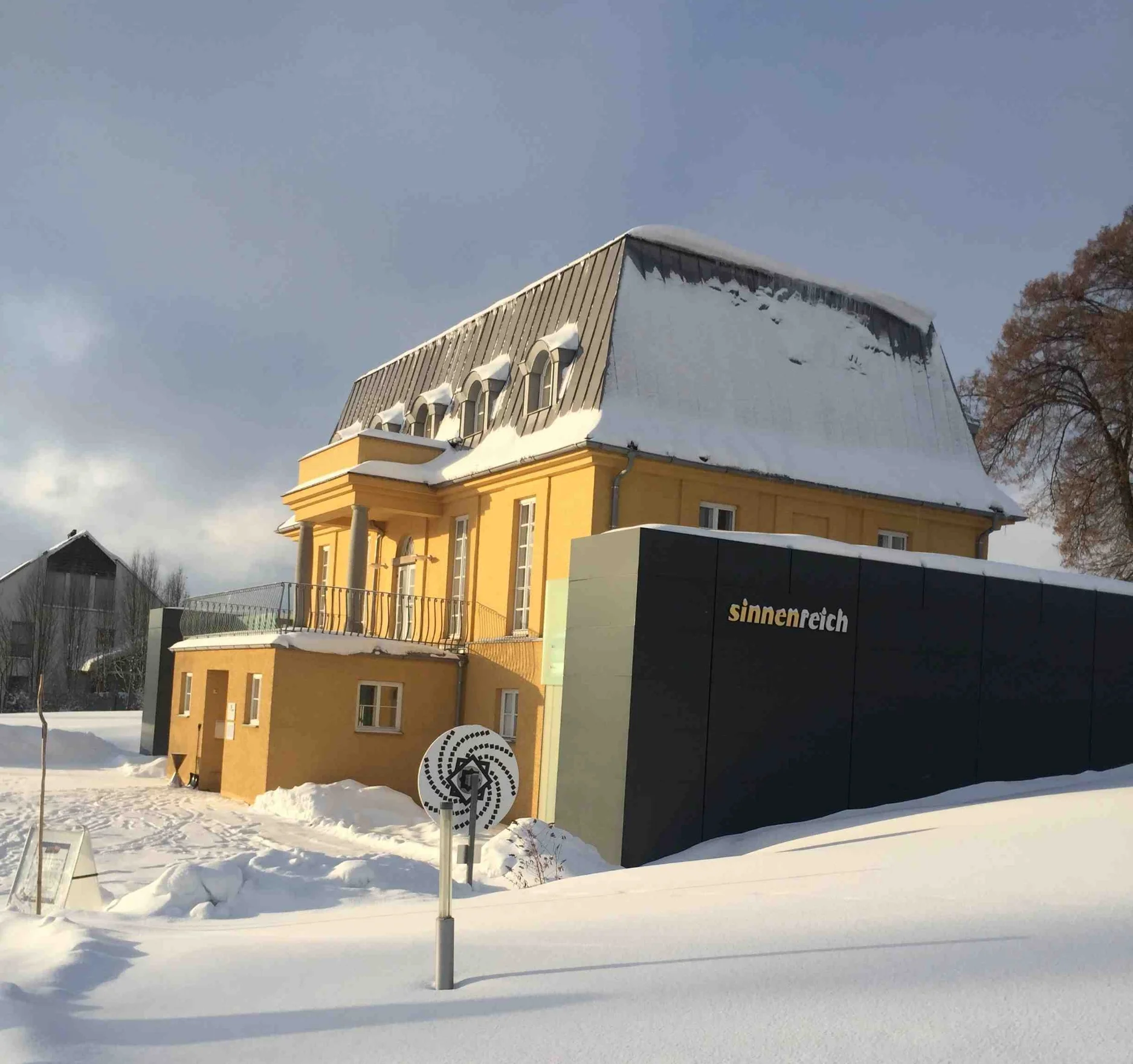 Von hier startet auch der sechs Kilometer weite Wanderweg „Sinnenreich“, der speziell für Familien und Kinder gestaltet wurde: mit unmöglichen Dreiecken, einem Wiesenlabyrinth, einem Barfußweg und einigem mehr. Anfang und Ende der Wanderung ist der Spielplatz im Park der Villa Sinnenreich.
