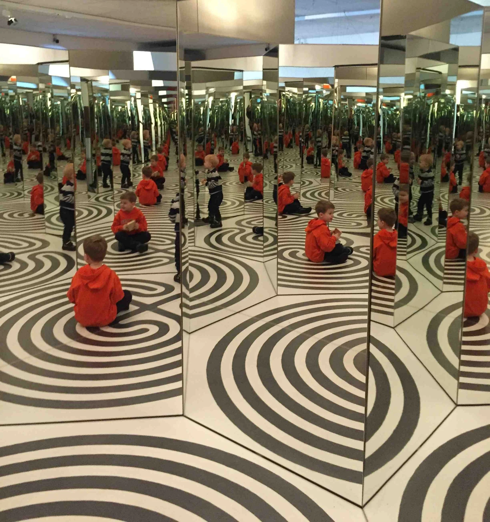 Auch im Spiegel-Oktogon, das die Kinder alleine betreten können, sehen sie sich unendlich vervielfacht und können sich von allen Seiten betrachten. Draußen warten Spiegel, die verzerren, dick und dünn machen.
